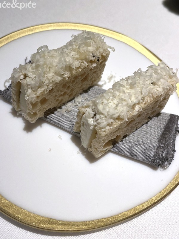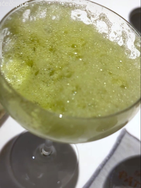 Ti uvodni botanasi (zalogaji) postavili su ton duhovitošću i preciznošću. Topla i hladna Margarita bila je razigrana reinterpretacija klasičnog koktela, poslužena kao ledena Margerita (limeta je zamijenjena zelenom mandarinom) s toplom pjenicom (60ºC, s bjelanjkom sa šećerom, nešto soli, tekile i soka zelene mandarine) na vrhu, slojeviti temperaturni pripravak koji evocira citruse i agavu. Maslina “cantina” je, pak, bila maslina transformirana modernističkom tehnikom sferifikacije (sferična tekućina od maslina) - bomba okusa koja ističe note salamure i bilja i ujedno predstavlja naklon El Bulliju, u kome je tehnika nastala.