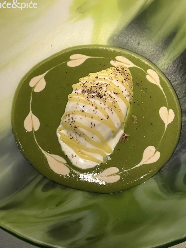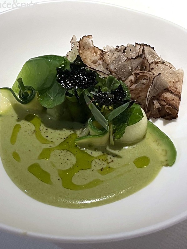 Slijedila je reinterpretirana „nogada” sa smokvama i grožđem, koja je na suptilan način prizvala chiles en nogada putem kremoznosti i voćnosti, a ne ljutinom (redizajnirana kompozicija spajala je kremasti umak od orašastih plodova i slatko voće). Jelo Trideset vrsta zelenog povrća i trava, oda zelenom mediteranskom i meksičkom bilju) slavilo je obilje biljnog svijeta, dok je sezonska Hladetina od gljiva (nježni žele od gljiva s dubokim umamijem i zemljanom ravnotežom) donijela impresivnu dubinu. Izvrsno odmjereno jelo Trilja sa šafranom i njokima od kukuruza spojila more i kopno, mediteransku ribu, temeljac s mirisom šafrana i meksičku masu u dijalog dviju kultura. Jelo „Chicarrón“ i jegulja donijelo je raskoš - kontrast hrskavosti „svinjske kožice“ i punine masne jegulje, premazane i spravljene na robata grillu.