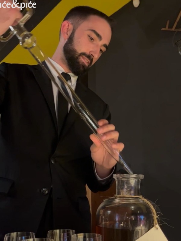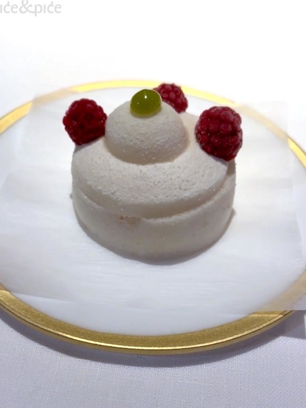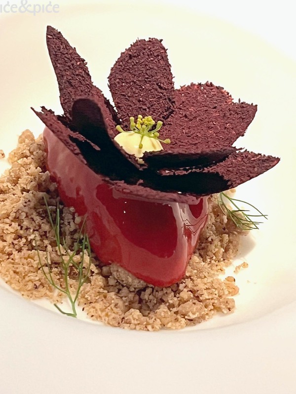 Deserti su večer zaključili lakoćom i nostalgijom. Pred-desert od ličija, rajčice i maline, svježi intermezzo koji uravnotežuje voćnu slatkoću i kiselost osvježilo je nepce prije velikog finala nazvanog Slatki karusel - “nochebuena”, aromatični desert s toplim začinskim notama, precizni millefeuillea od manga (slojevi hrskavog tijesta s bujnom kremom od manga) i razigrane, ali profinjene interpretacije s’moresa (kanadska i američka poslastica koja se često jede tijekom kampiranja, sastoji se od pečenog sljezovog kolačića i sloja čokolade koji se nalaze između dva graham krekera), tu uravnotežena čokoladom i dimom. Završni slatkiši pod imenom Bomboni (čokoladna cigara punjena čokoladnim ganachemo i eclaire meringa s kavom i cimtom) -označili su završnu notu - diskretni, precizni i tiho zabavni.