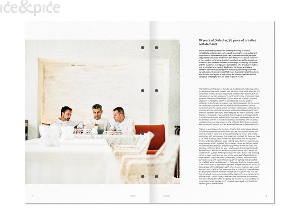 2. Uvod – Tekst koji proširuje priču o putu chefova od rada u elBulli do osnivanja restorana Compartir, a potom i Disfrutar. Opisuju osnovna načela svoje kulinarske metode, naglašavajući koherenciju, neovisnost i rigorozan pristup kreativnosti.