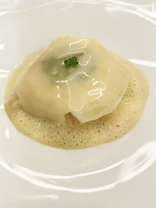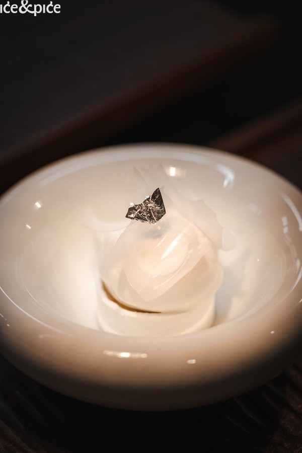 Royerov slijed Škamp „comme un dumpling“ (shiso, vin jaune, katsuobushi) sjajno je spojio slatkim mesom škampa punjenu azijsku okruglicu, vin jaune (posebna i karakteristična vrsta bijelog vina koja se proizvodi u regiji Jura u istočnoj Francusko, slična suhom fino šeriju, a svoj karakter dobiva dozrijevanjem u bačvi ispod filma kvasca, poznatog kao voile, na površini vina) te katsuobushi (pirjana, dimljena i fermentirana skipjack tuna, uz algu kombu, glavni sastojak dashija).