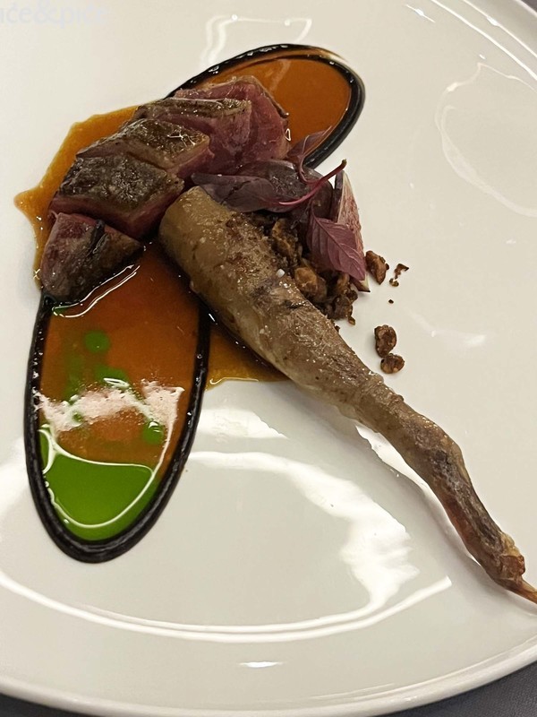 „Ovo je jelo koje jako dobro predstavlja našu kuhinju. Golub se poslužuje u kori od kambodžanskog papra koji se zove kampotski papar. Golub se poslužuje na različite načine – yakitori napravljen od srca; vrlo lagana i moderna verzija parfaita, napravljena od jetre, a zatim se prsa (u ovom slučaju radilo se o batku, op.a) poslužuju u kori od ovog prekrasnog, vrlo mirisnog, vrlo dugotrajnog papra iz Kampota u Kambodži. Morali smo isprobati mnogo različitih recepata samo da bismo imali pravu količinu začina. Ovo je jelo koje zaista naglašava ono u što vjerujem u smislu nabave namirnica, jer pticu dobavljamo iz vrlo specifičnog dijela Francuske, iz Bretanje, a sam papar zaista predstavlja ljutinu jugoistočne Azije. Rabimo tehnike kuhanja koje su francuske, ali i japanske, poput malo yakitorija na binchotan ugljenu“.