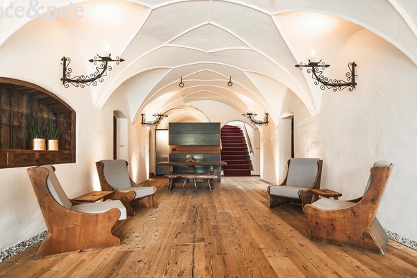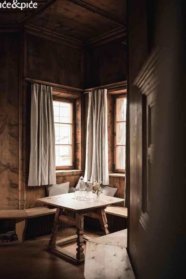 No kuća nikako nije muzej. Niederkofler i njegova ekipa Mo-Food pažljivo su je restaurirali i reinterpretirali prostor tako da baština i suvremena gostoljubivost dijele isti stol. Sobe kombiniraju minimalistički moderni komfor s povijesnim detaljima, dok prozori otvaraju pogled na vrtove i terase s panoramom Dolomita.