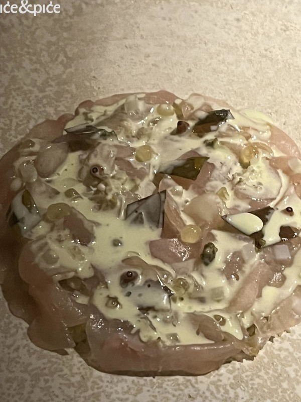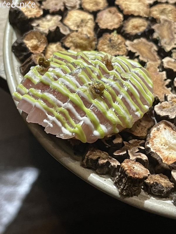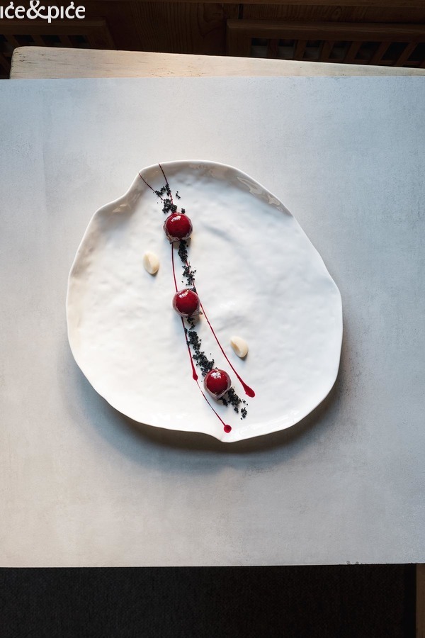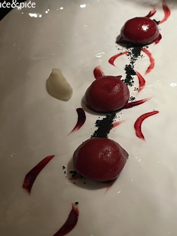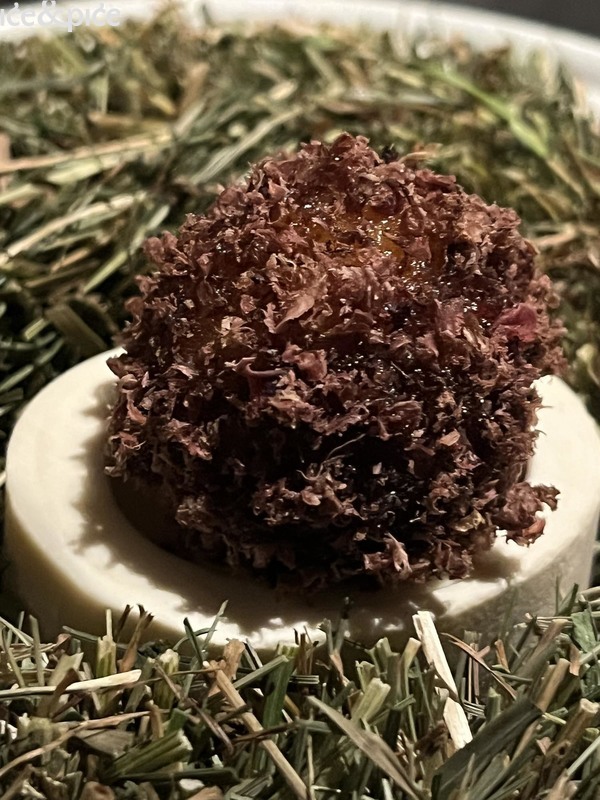 Nakon što nam se u aperitiv baru na razgovor pridružio i Norbert Niederkofler, prešli smo za stol u blagovaonici restorana. Najprije je posluženo malo jelo inspirirano japanskim takoyakijem (zalogaj u obliku kuglice napravljene od tijesta na bazi pšeničnog brašna i pečena u posebno oblikovanoj tavi, obično punjena mljevenom ili kockicama hobotnice, ostacima tempure, ukiseljenim đumbirom i mladim lukom), zanimljiva referenca na street food, ali tu pripremljena s lokalnim sastojcima, konkretno od, na otvorenoj vatri, pečenog repa sivog alpskog goveda, sa slatko-kiselom glazurom od češera bora i dovršeno „bottargom“ od srca sivog alpskog goveda.