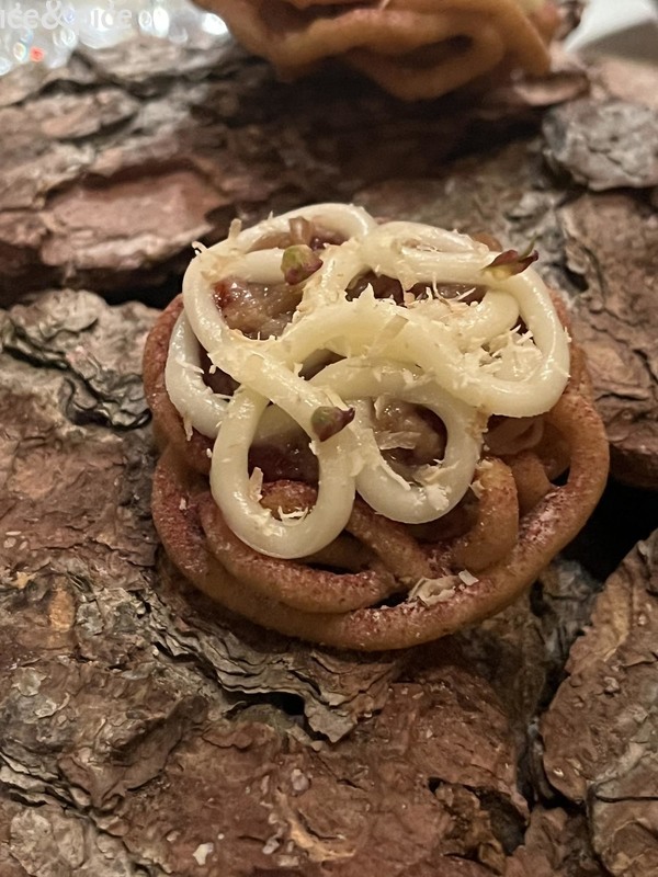 Početak je bio gotovo razigran. Vafl, interpretiran u slanoj alpskoj varijanti, sa salaticom od crnog kupusa, nešto jelenova pršuta i emulzijom s klicama bora otvorio je večer. Strauben, tradicionalno tirolsko slatko prženo tijesto, stigao je zatim u elegantnoj minijaturnoj slanoj verziji, od kestenovog brašna s chutnyjem od crnih smokava i nešto senfa, sve okrunjeno kremom od šest mjeseci odležanog sira, podsjećajući da i najrustikalnije regionalne grickalice mogu postati dio visoke gastronomije. Niz je nastavio delikatni smørrebrød, nordijski otvoreni sendvič s lagano usoljenom riječnom ribom agone, kaparima medvjeđeg luka (delicija napravljena od nezrelih sjemenki divljeg češnjaka, koje nude hrskav, oštar okus češnjaka), crème fraîchem i vlascem. Tu je bila i verzija tempeha (tradicionalni indonezijski fermentirani proizvod od soje), u ovom slučaju od heljde i leće, nadjeven divljim gljivama iz zimnice, povezanim s nešto brašna lupine (mahunarka bez glutena, srodna kikirikiju i soji).