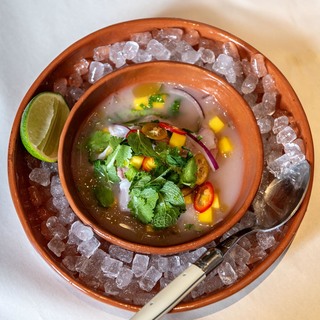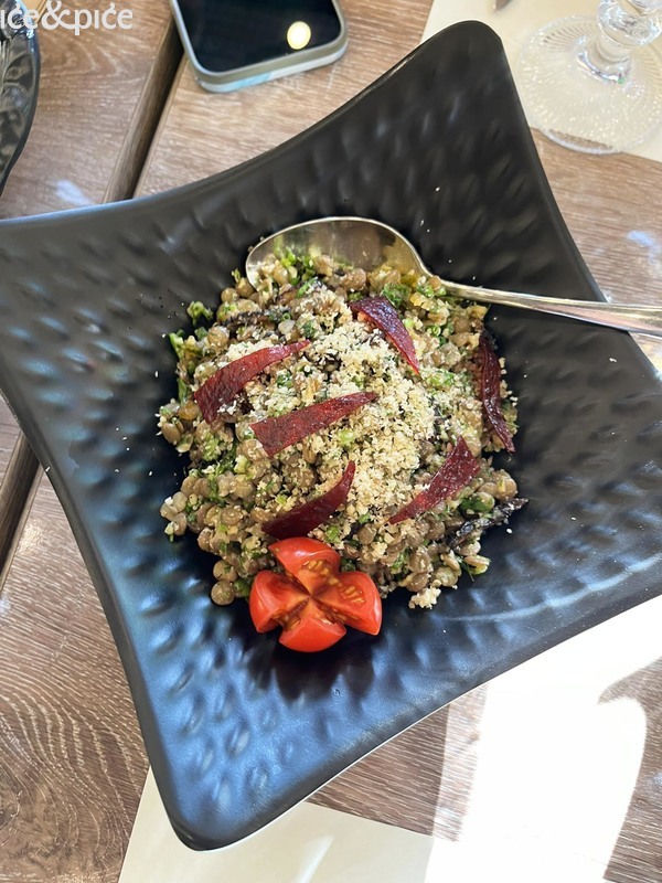 Mi smo uživali u meniju koji je započeo svježe pečenom focacciom i ručno branim grčkim maslinama sa sicilijanskim origanom, maslinovim uljem extra vergine, zatim gazpachom od yuzua, mousseom od fete (avoklado, kozice, limunska trava, feta, naznake yuzua, tartar od krastavca i špinata, salata s citronetteom i mousseeom od fete), sparen s koktelom od sakea, cordiala od riže, šoju od grožđa i pjenušca) te ceviche od bjelice (vrst bijele ribe iz jezera Sevan), uz koji je poslužen koktel od dvostruko destiliranog slatkog vina, pasjeg trna i stapkastog celera.
