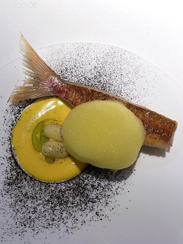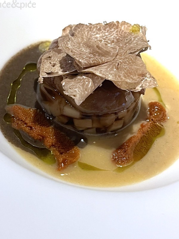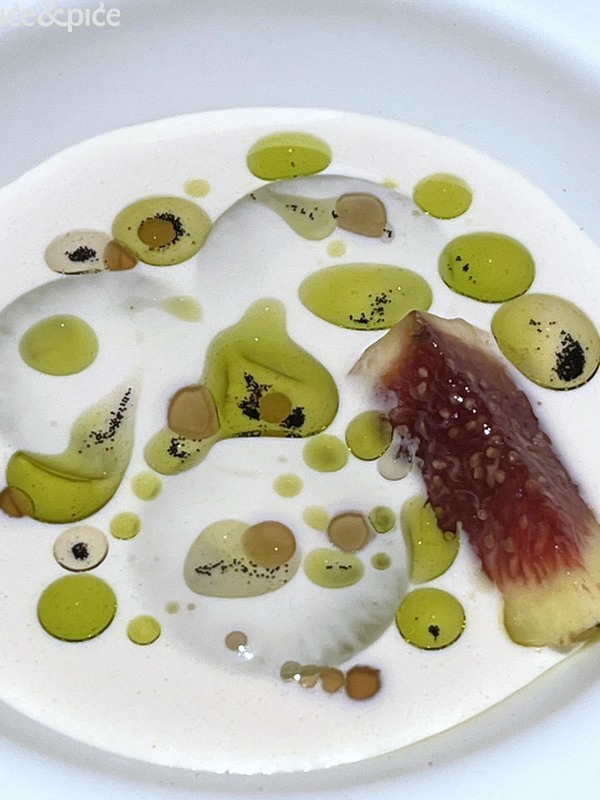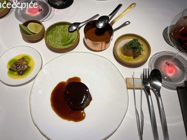 Slijedila je reinterpretirana „nogada” sa smokvama i grožđem, koja je na suptilan način prizvala chiles en nogada putem kremoznosti i voćnosti, a ne ljutinom (redizajnirana kompozicija spajala je kremasti umak od orašastih plodova i slatko voće). Jelo Trideset vrsta zelenog povrća i trava, oda zelenom mediteranskom i meksičkom bilju) slavilo je obilje biljnog svijeta, dok je sezonska Hladetina od gljiva (nježni žele od gljiva s dubokim umamijem i zemljanom ravnotežom) donijela impresivnu dubinu. Izvrsno odmjereno jelo Trilja sa šafranom i njokima od kukuruza spojila more i kopno, mediteransku ribu, temeljac s mirisom šafrana i meksičku masu u dijalog dviju kultura. Jelo „Chicarrón“ i jegulja donijelo je raskoš - kontrast hrskavosti „svinjske kožice“ i punine masne jegulje, premazane i spravljene na robata grillu.