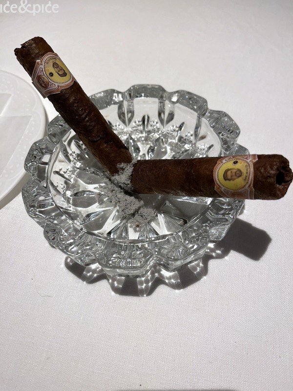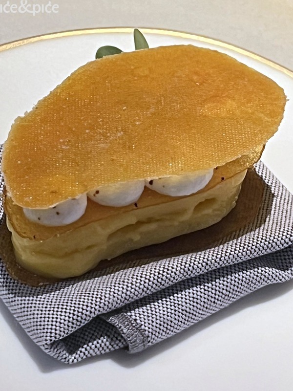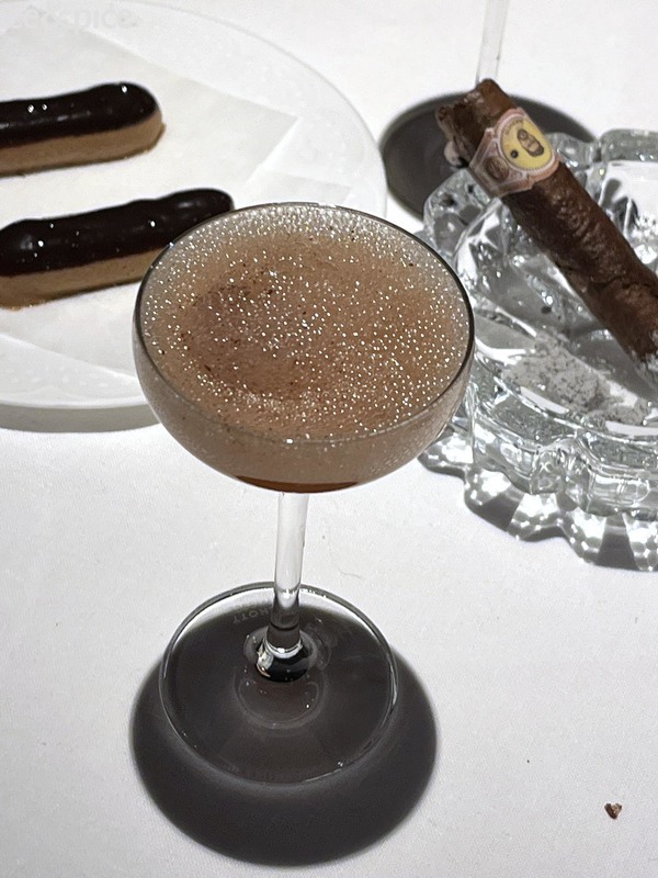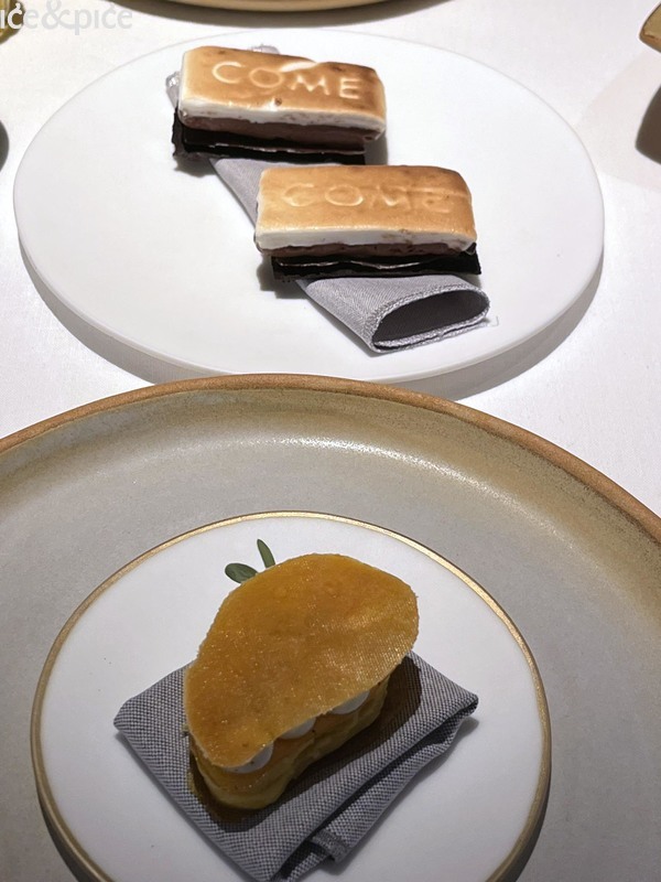 Deserti su večer zaključili lakoćom i nostalgijom. Pred-desert od ličija, rajčice i maline, svježi intermezzo koji uravnotežuje voćnu slatkoću i kiselost osvježilo je nepce prije velikog finala nazvanog Slatki karusel - “nochebuena”, aromatični desert s toplim začinskim notama, precizni millefeuillea od manga (slojevi hrskavog tijesta s bujnom kremom od manga) i razigrane, ali profinjene interpretacije s’moresa (kanadska i američka poslastica koja se često jede tijekom kampiranja, sastoji se od pečenog sljezovog kolačića i sloja čokolade koji se nalaze između dva graham krekera), tu uravnotežena čokoladom i dimom. Završni slatkiši pod imenom Bomboni (čokoladna cigara punjena čokoladnim ganachemo i eclaire meringa s kavom i cimtom) -označili su završnu notu - diskretni, precizni i tiho zabavni.