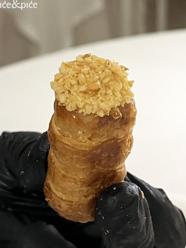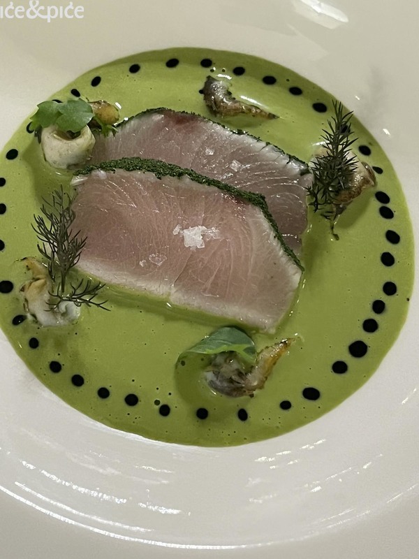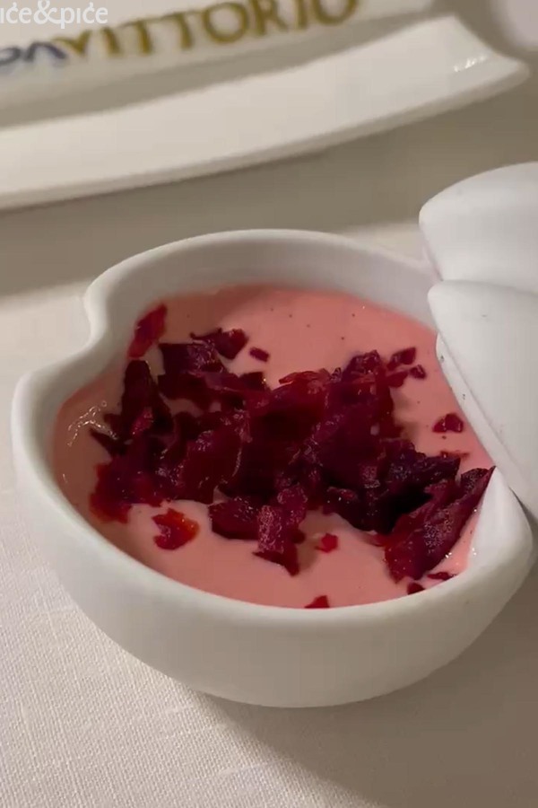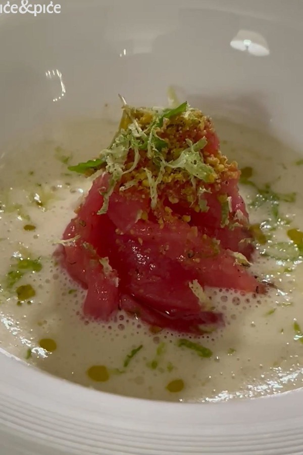 Morski plodovi nastavljali su se tijekom menija s karakterističnom jasnoćom okusa Da Vittorija. Špageti od tune s bagna caudom (topli umak od češnjaka, inćuna, crvenog vina i ekstra djevičanskog maslinovog ulja) i crumbleom od pistacija bio je u obliku tune narezane u tanke trakice nalik špagetima, prelivene toplom i aromatičnom bagna caudom čija je dubina inćuna parirala svježini pistacija u prahu i ribanoj korici limuna, stvarajući dijalog toplog i hladnog, mekanog i hrskavog. Tu je savjet bio da se sastojci prije jela pomiješaju. Jelo je posluženo s tri vrste prozračnog hrskavog kruha u obliku prstiju.
