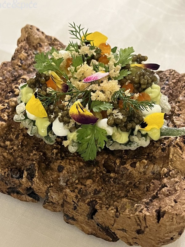 A onda je krenuo službeni dio menija. List shisoa, lagano pržen u prozračnom tempura tijestu, nježno se lomio otkrivajući hladnu kremu od avokada i slanu eksploziju ikre lososa i kavijara - igra kontrasta između hrskavog i kremastog koja budi nepce. Slijedilo je jedan od klasika kuće - „Jaje a la jaje“, studija raskoši i rafiniranosti, poslužena u čaši, slojevi pirea od jabuke i četiri vrste jaja (kremasta kajgana, poširani žumanjak, jajašca lososa i kavijar) s crème fraîcheom i svilenkastom kremom od krumpira na vrhu, sve za stolom okrunjeno kavijarom. Savjet je bio da se jede odozdo prema gore, bez miješanja. Jelo ima dva neobična svojstva – bogato je, a nije teško te se doima domaćim, a opet nevjerojatno elegantnim, pa istovremeno budi nostalgiju i osjećaj avangarde.