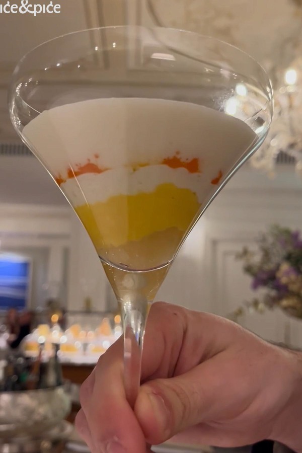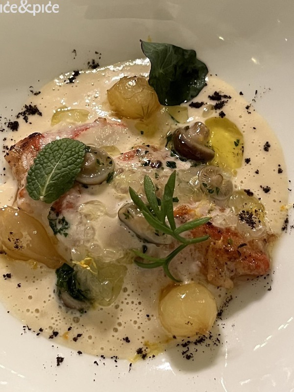 Gof, mariniran u kamilici i začinskim travama, poslužen je s gelom od limuna, puževima i umakom od lista peršina. Nastavilo se Kraljevskom krabom, kremom od raka i marcipanom te gelom od agruma. Tu se rak spojio s blagom slatkoćom marcipana i osvježavajućim citrusima – neočekivano, ali savršeno skladno. Romb na ražnjiću donio je nježno kiselkasti dodir yuzu majoneze i dimnu notu romb barbacue umaka, a svaki element naglašavao je prirodnu slatkoću ribe.