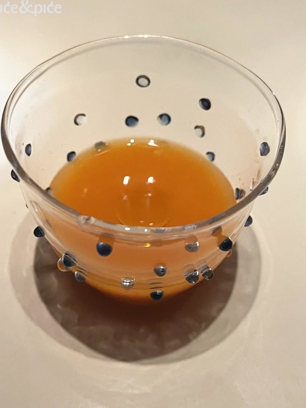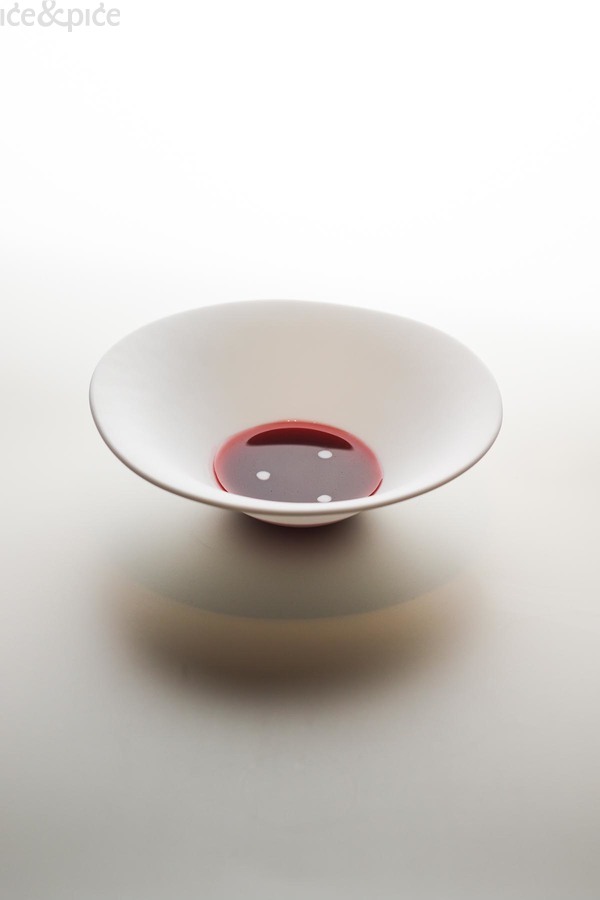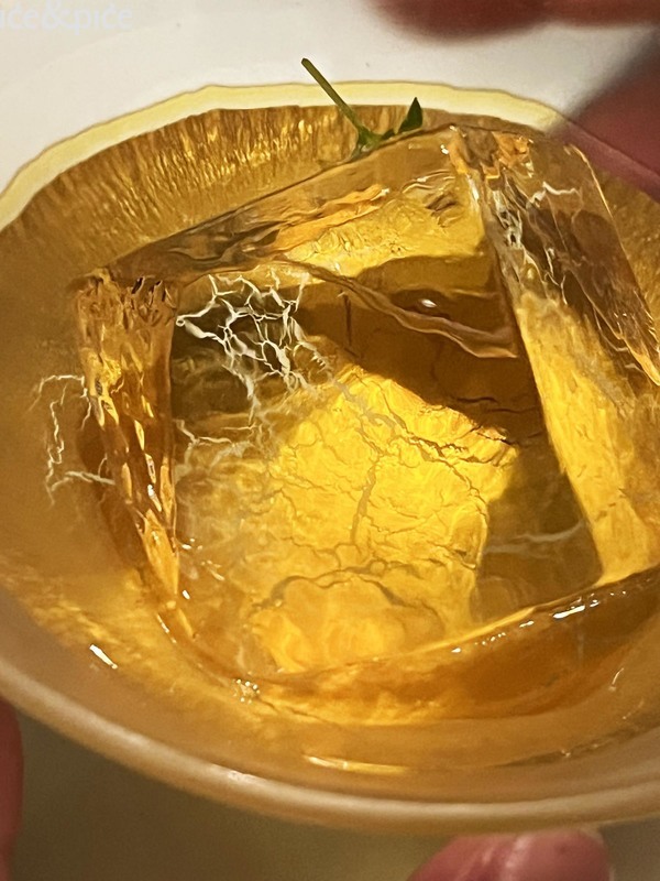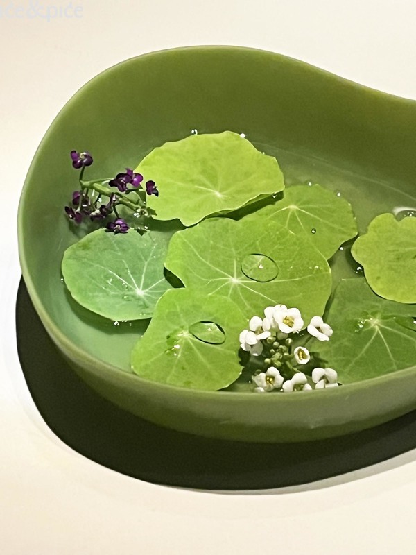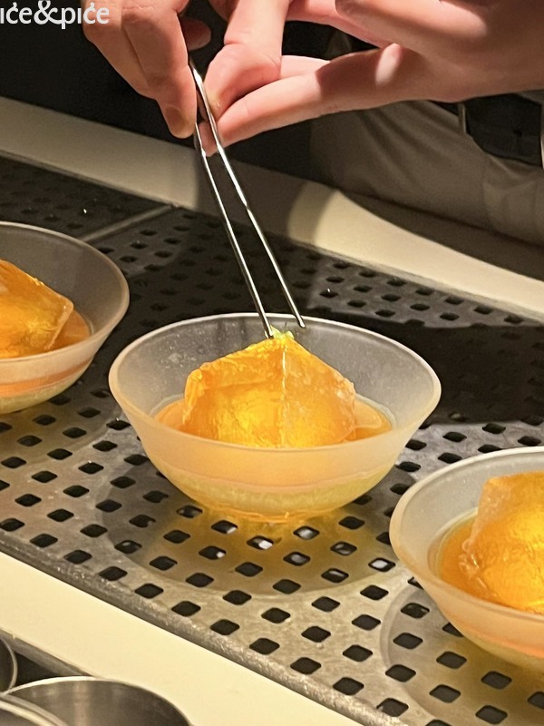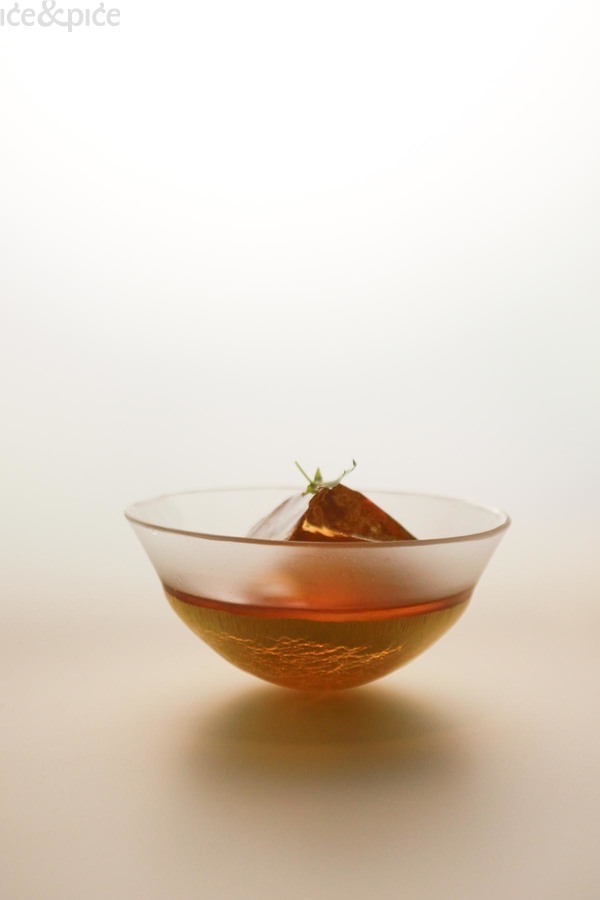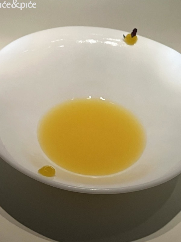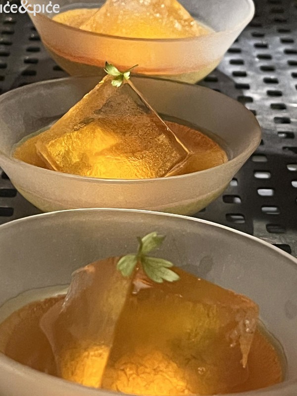 · Hladetina se referira na povijesnu tehniku bistrenja i strukture, tu reinterpretirana kao bistri, slani napitak. Korak je inspiriran hladetinom, klasičnim francuskim jelom, a sastojci biljem tipičnim za francuske temeljce, rabeći namirnice iz te regije, gdje je meso ili riba obavijeno slojem želatine. Taj uvod postavlja ključnu ideju Esencije - tradicija se ne odbacuje, već destilira. Tekućina u ovom koraku je kapsulirana u želatinu (gost je ne konzumira), koju je potrebno probušiti slamkom.