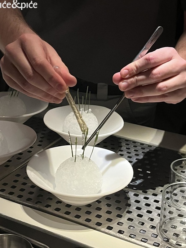 U ovom piću, gost započinje pripremom nepca s borovim iglicama premazanim medom balzamičnog stila prožetim eteričnim uljima i terpenima koji evociraju eukaliptus i smolu. Tekućina je kombinacija vina maceriranog s vrganjem, likerom od mahovine i likerom od smole. Ta mješavina stvara aromatične nijanse koje podsjećaju na planinsku šumu nakon kiše: note mokre zemlje, vlage i lišajeva. Led nije samo dekoracija. Njegova vrlo fina tekstura, slična snijegu, pruža savršenu ravnotežu razrjeđivanja i temperature. Zbog toga se piće ne poslužuje hladno. Kontrast između „snijega“ i tekućine sobne temperature postiže savršenu ravnotežu.