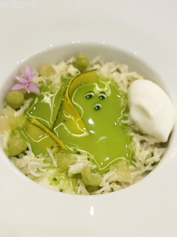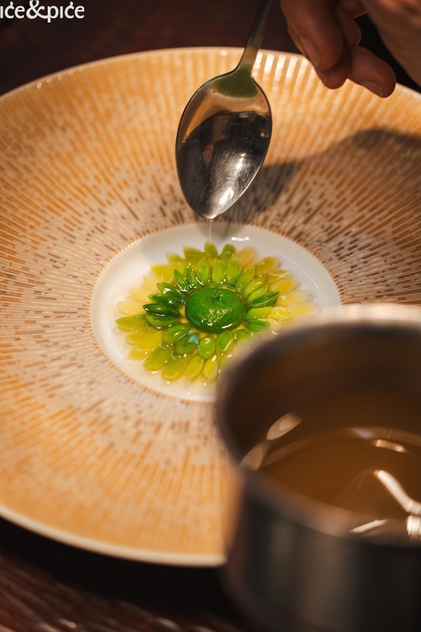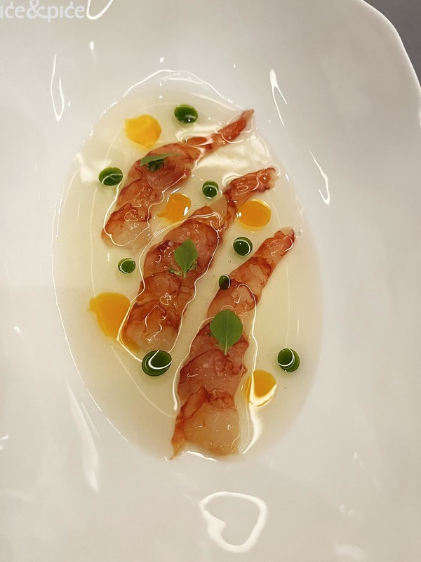 Royerov slijed Škamp „comme un dumpling“ (shiso, vin jaune, katsuobushi) sjajno je spojio slatkim mesom škampa punjenu azijsku okruglicu, vin jaune (posebna i karakteristična vrsta bijelog vina koja se proizvodi u regiji Jura u istočnoj Francusko, slična suhom fino šeriju, a svoj karakter dobiva dozrijevanjem u bačvi ispod filma kvasca, poznatog kao voile, na površini vina) te katsuobushi (pirjana, dimljena i fermentirana skipjack tuna, uz algu kombu, glavni sastojak dashija).
