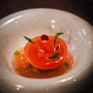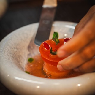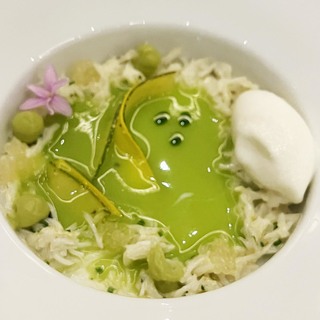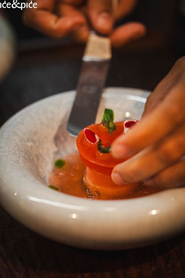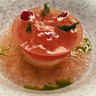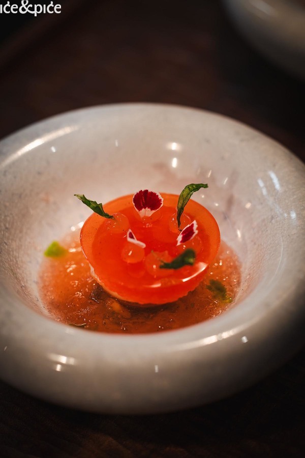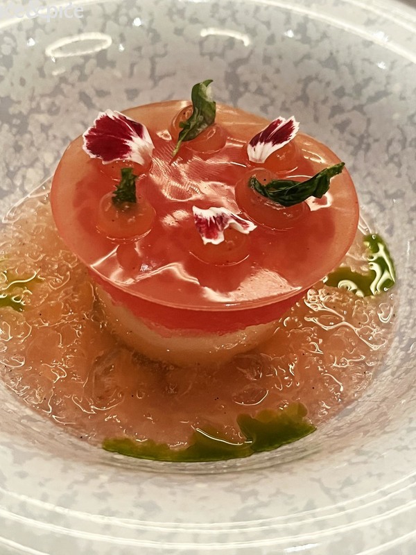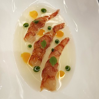 Royer je slijedio svojim predjelom Sirova crvena kozica (rajčica, bosiljak, čili), vjerojatno najljepšim jelom večeri i, uz verziju Maura Colagreca iz restorana Mirazur, najdojmivijom od mnogo postojećih, sa savršenom interakcijom glavne namirnice s rajčicom, bosiljkom i čilijem.