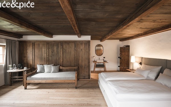No kuća nikako nije muzej. Niederkofler i njegova ekipa Mo-Food pažljivo su je restaurirali i reinterpretirali prostor tako da baština i suvremena gostoljubivost dijele isti stol. Sobe kombiniraju minimalistički moderni komfor s povijesnim detaljima, dok prozori otvaraju pogled na vrtove i terase s panoramom Dolomita.