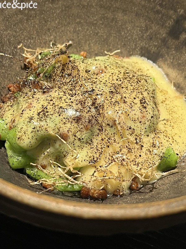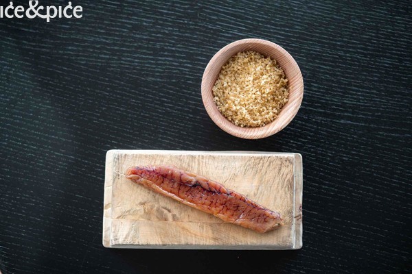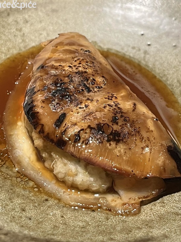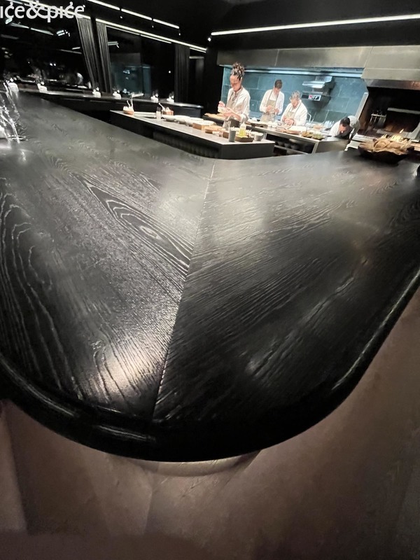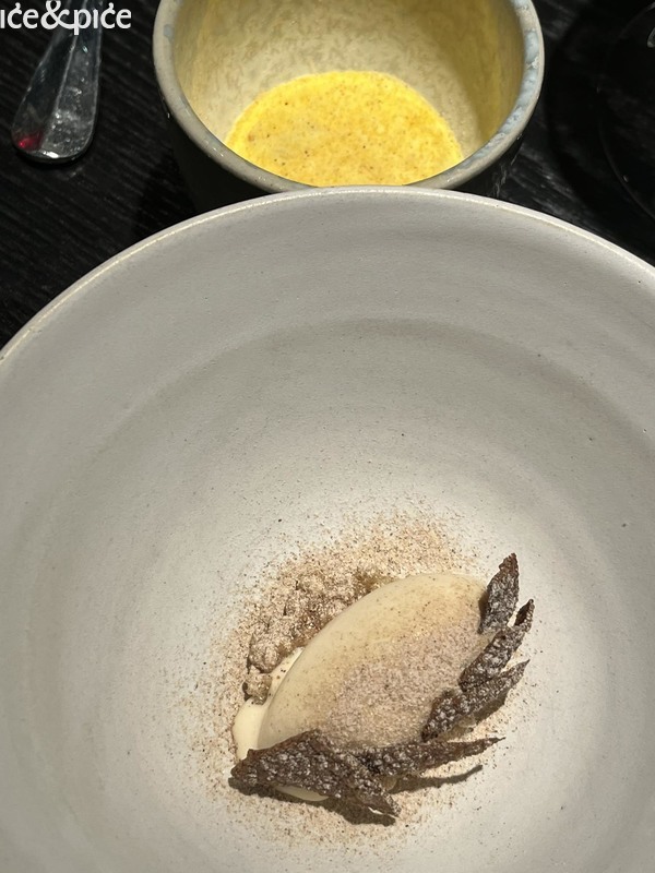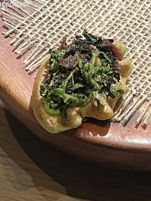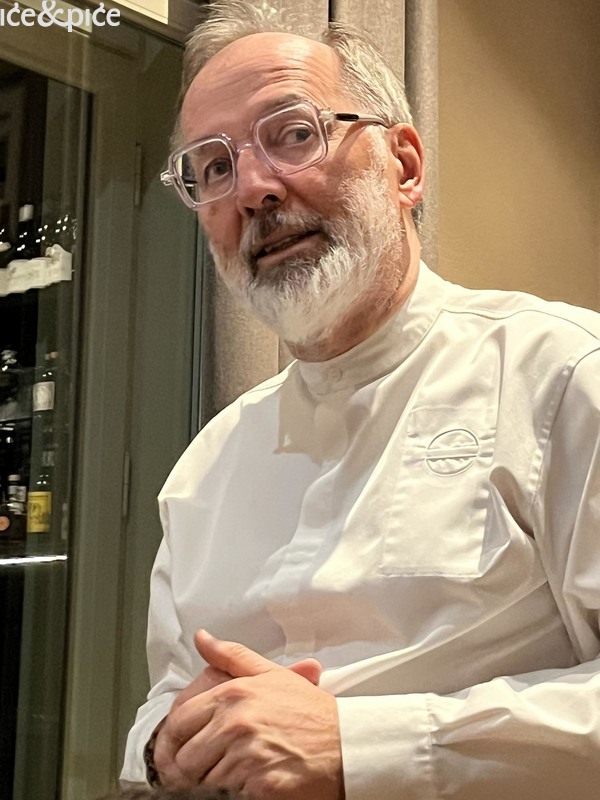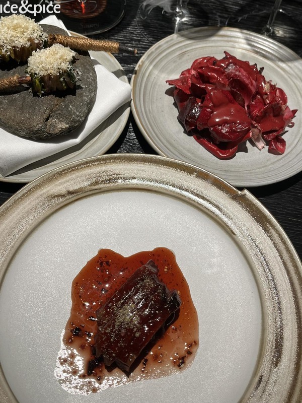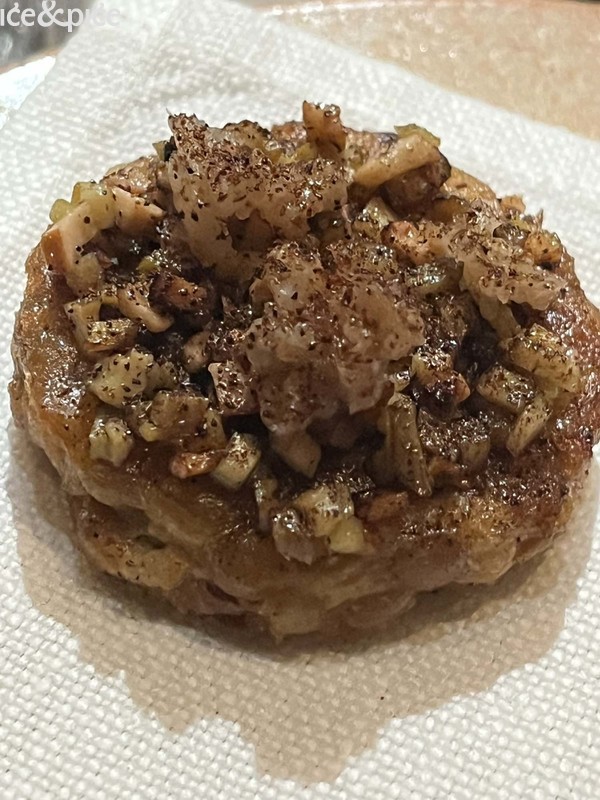 Nakon što nam se u aperitiv baru na razgovor pridružio i Norbert Niederkofler, prešli smo za stol u blagovaonici restorana. Najprije je posluženo malo jelo inspirirano japanskim takoyakijem (zalogaj u obliku kuglice napravljene od tijesta na bazi pšeničnog brašna i pečena u posebno oblikovanoj tavi, obično punjena mljevenom ili kockicama hobotnice, ostacima tempure, ukiseljenim đumbirom i mladim lukom), zanimljiva referenca na street food, ali tu pripremljena s lokalnim sastojcima, konkretno od, na otvorenoj vatri, pečenog repa sivog alpskog goveda, sa slatko-kiselom glazurom od češera bora i dovršeno „bottargom“ od srca sivog alpskog goveda.