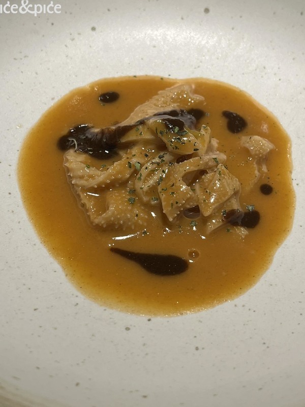 Za tim drvenim pultom pred nas je najprije stigao prekrasno pečeni kruh i plitica sa svinjskom mašću, savršena mazalica za zimsku večer na vrhuncu. Sasvim logično, u istome stilu, slijedila ih je zdjelica Spatzlana, lokalna verzija Spätzla, vrsta tjestenine karakteristična za njemačka govorna područja, često poslužena uz umake ili kao prilog uz mesna jela, odnosno s dodatkom sira (Käsespätzle). Spatzlan je dio tradicije, priča koja budi uspomene iz djetinjstva i toplinu Južnog Tirola. U Atelieru oni su živahni, zbog medvjeđeg luka s kojim su napravljeni, a koji oslobađa svježe i divlje note, dok ih dodani zabaione obavija neočekivano slatkom oblogom, sve posuto cvjetovima vlasca i hrskavim komadićima svinjetine i preliveno oker svinjskom mašću, dimljenom i istopljenom iz svinjskog vrata. Sve zajedno, ravnoteža kontrasta, sjećanja i mirisa koja se u jelca uvlači poput dalekog odjeka.